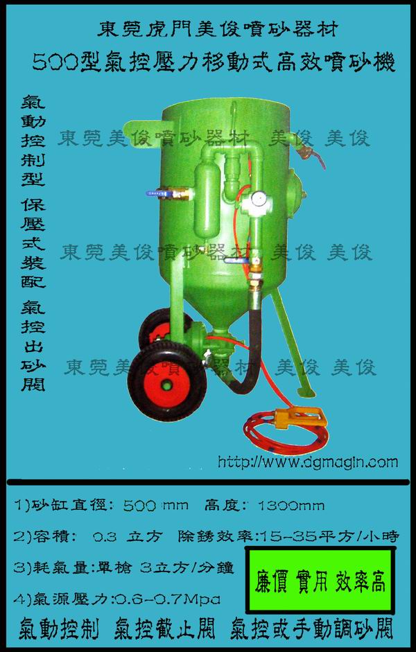 特点:气动控制,故障率低,易损件少,投资少,效率高,轮式结构,定点及移动喷砂两用,移动方便. |