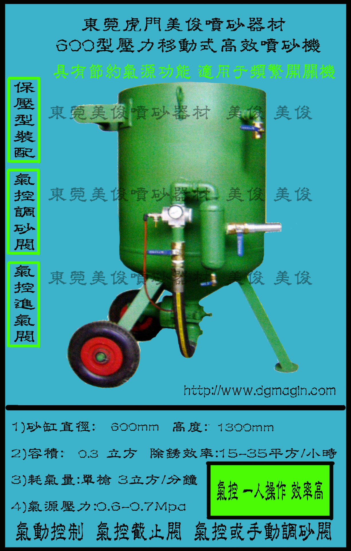 特点:气动控制,故障率低,易损件少,投资少,效率高,轮式结构,定点及移动喷砂两用,移动方便.