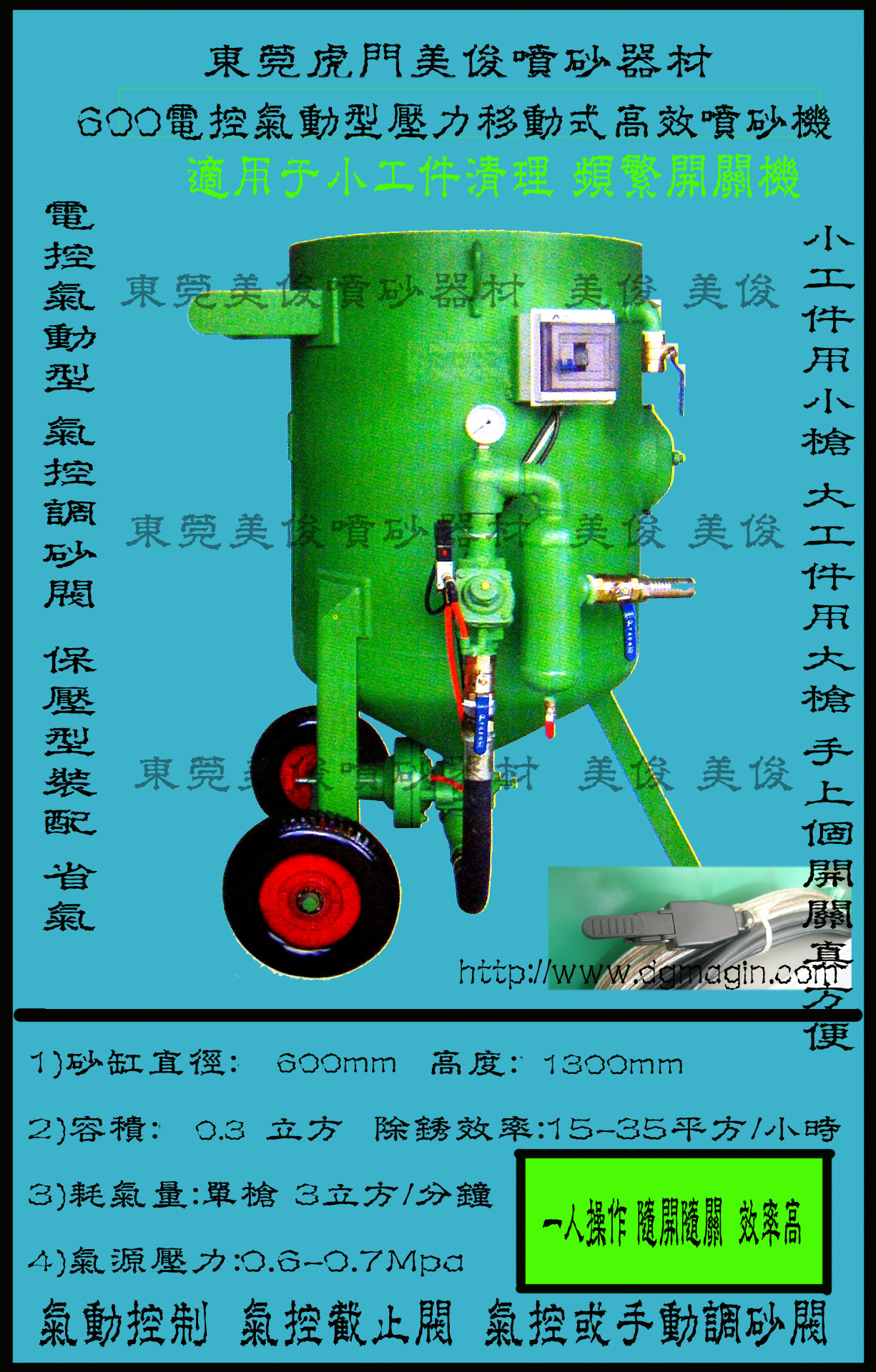 特点:电控气动控制,故障率低,易损件少,投资少,效率高,轮式结构,定点及移动喷砂两用,移动方便.