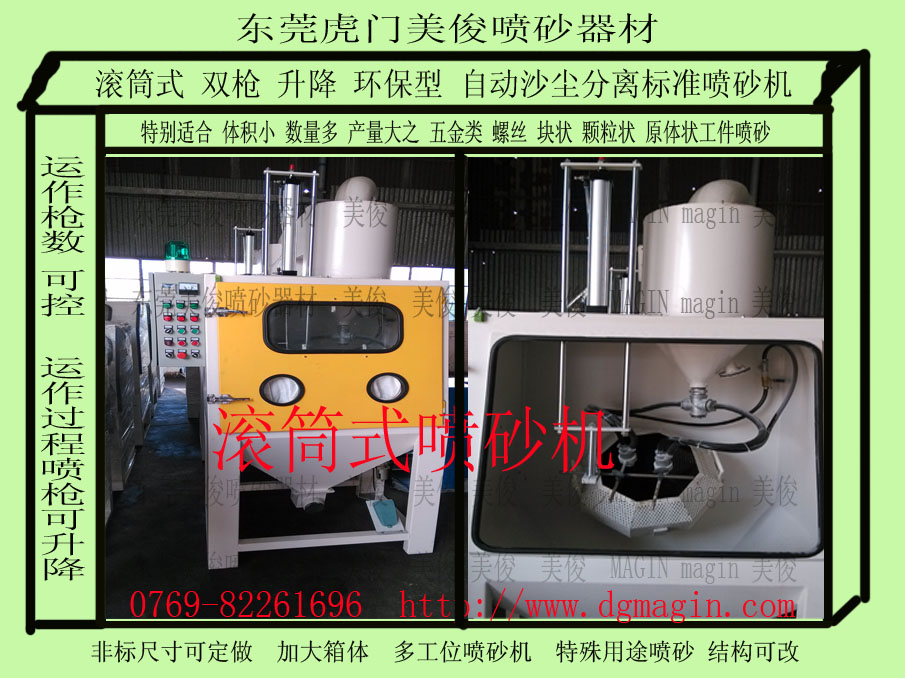 特点:具有定时停止,自动/手动喷砂双选择功能,呼叫功能,装配2把喷砂枪,可单动或联动使用,前门开关,工件置取方便.