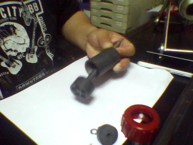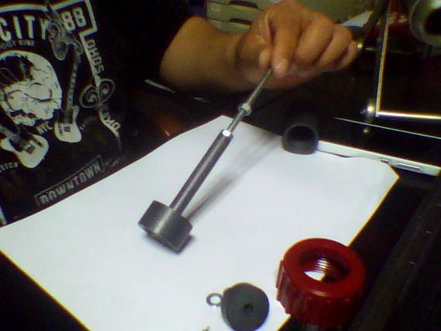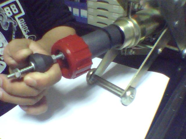 第六步:整个组建从前面放入枪体,拧好红色的喷枪螺纹盖(聚氨酯盖需要加水胶布或用胶水粘牢固,钢套拧紧即可),组装完成.