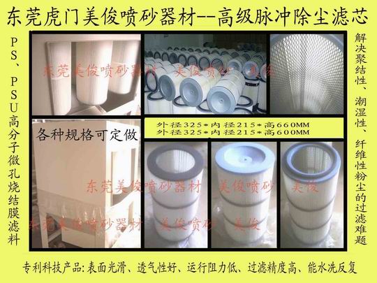 8.脉冲式喷砂机除尘滤芯:特殊工艺制作, 专利产品:PS、PSU高分子微孔烧结膜滤料,具有表面光滑、透气性好、运行阻力低、过滤精度高、能水冼反复使用等优点,相对于1微米粉尘过滤精度可达99.9%,广泛应用于工程机械(钻机)、电子、化工、烟草、建材、冶金等行业的除尘、超细粉回收及空气净化之用。解决了聚结性、潮湿性、纤维性粉尘的过滤难题,规格齐全,质量保证,清理方便,一抖即可脱尘.