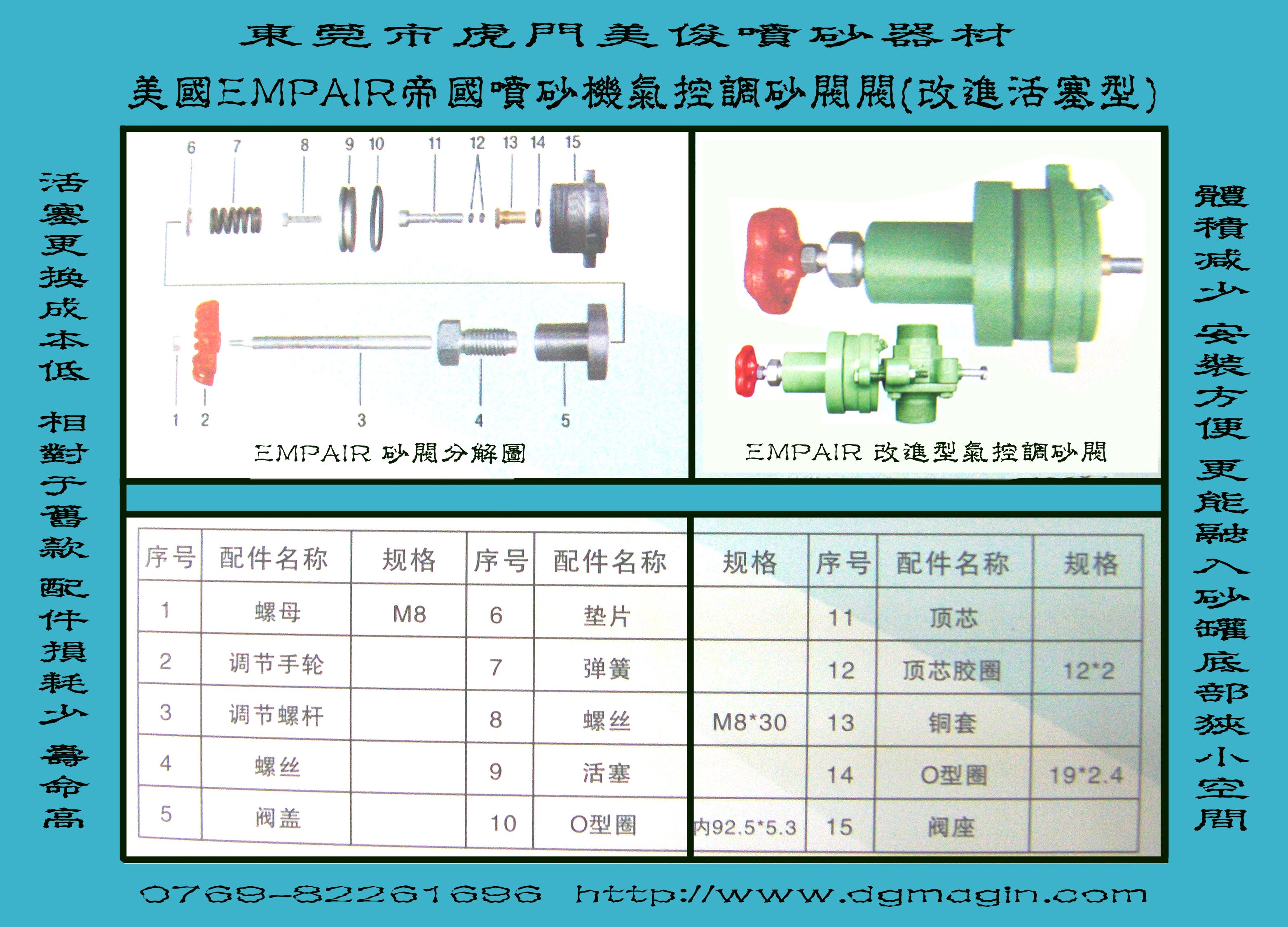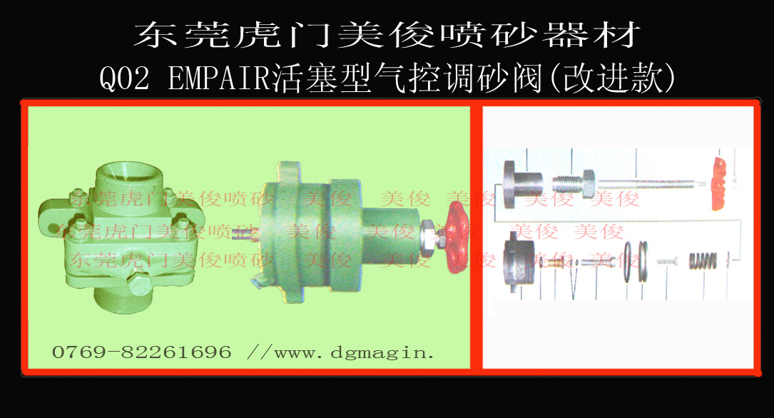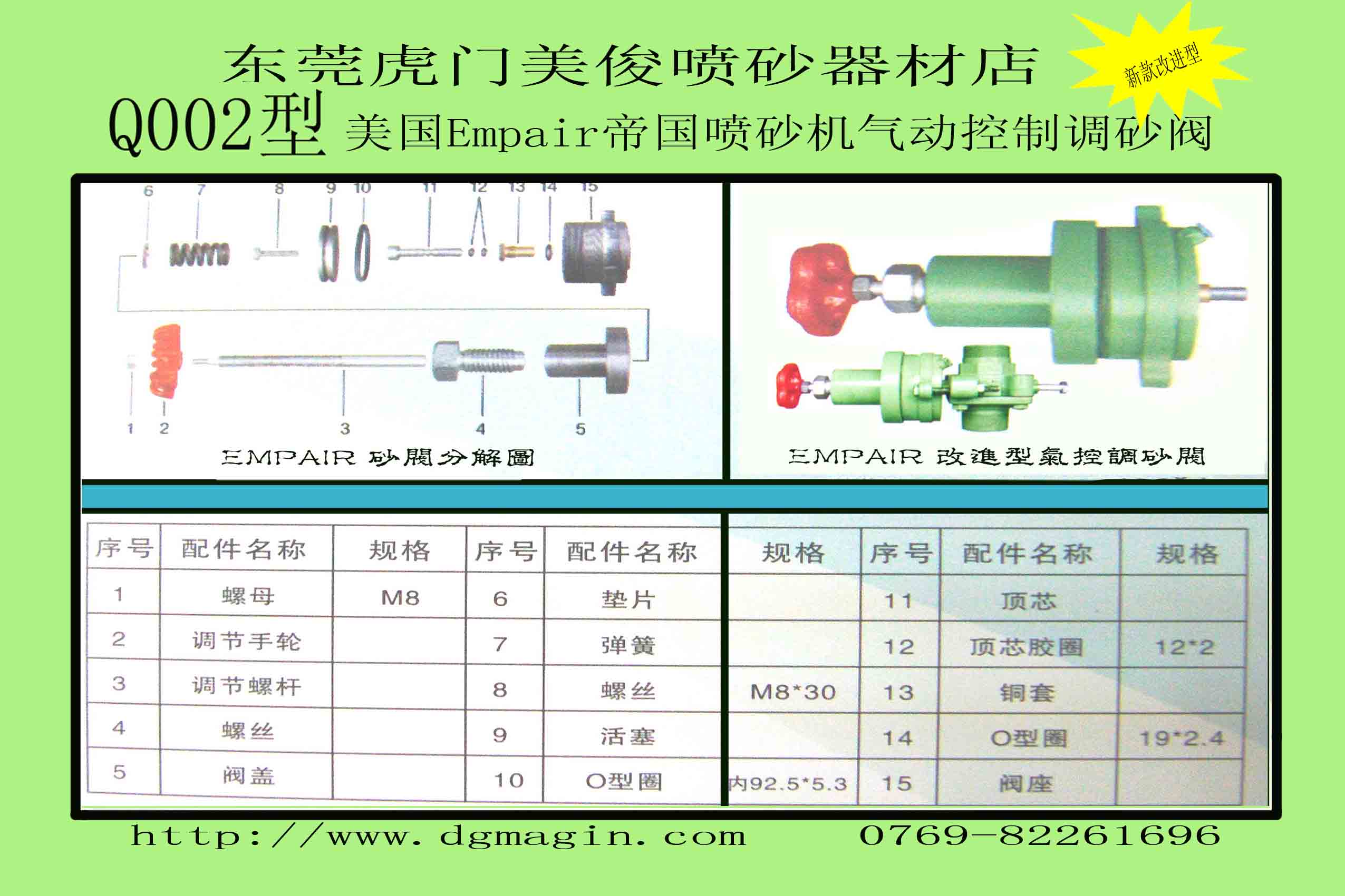 3)以上2步骤调整完后,试机工作,如果喷枪仍然不出砂或出砂量太大,则需调整砂阀右侧(即螺母后方)的手把开关,顺时针为减少砂量,逆时针为加大砂量.